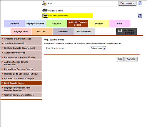 En mode Administrateur, sélectionnez [Auth.Util/Compte Départ.] - [Régl. Scan to Home], puis définissez [Régl. Scan to Home] sur [Activer] (par défaut : [Désactiver]).