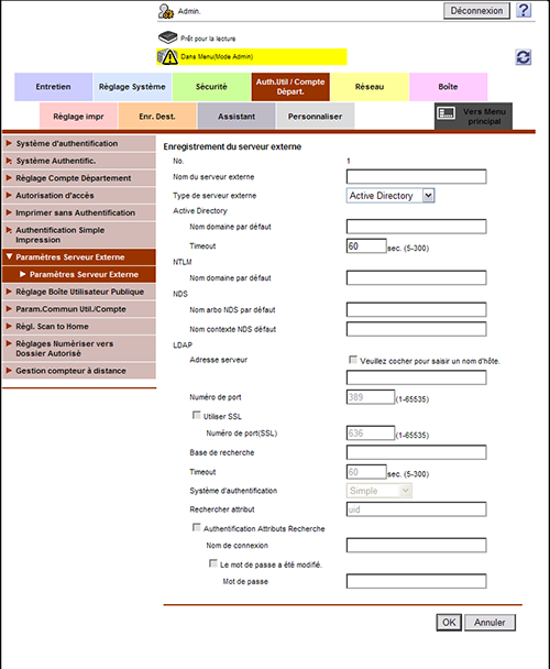 En mode Administrateur, sélectionnez [Auth.Util/Compte Départ.] - [Paramètres Serveur Externe] - [Editer], puis configurez les réglages suivants.