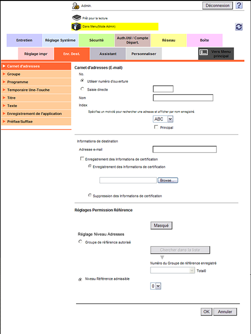 En mode Administrateur, sélectionnez [Enr. Dest.] - [Carnet d'adresses] - [Editer], sélectionnez [Définir le niveau directe de référence autorisé], puis définissez le niveau d'accès autorisé pour le carnet d'adresses.