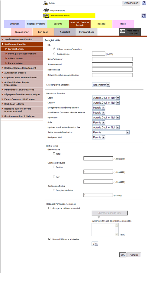En mode Administrateur, sélectionnez [Auth.Util/Compte Départ.] - [Système Authentific.] - [Enregist. utilis.] - [Editer], puis sélectionnez la case à cocher [Niveau Référence admissible] et définissez le niveau d'accès autorisé pour l'utilisateur enregistré.