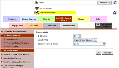 En mode administrateur, sélectionnez [Auth.Util/Compte Départ.] - [Système Authentific.] - [Param. admin.].