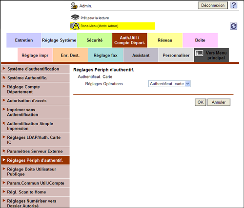 En mode Administrateur, sélectionnez [Auth.Util/Compte Départ.] - [Réglages Périph d'authentif.], puis sélectionnez le mode de connexion à cette machine (par défaut : [Authentificat. carte]).