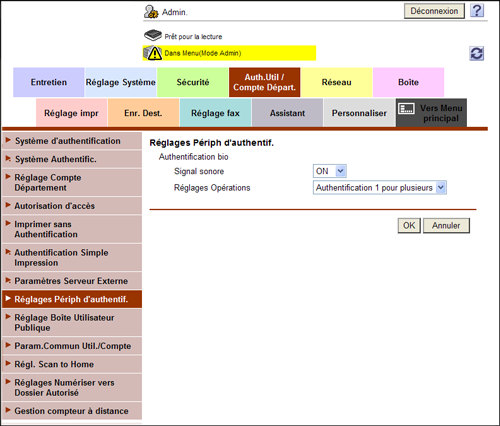 En mode Administrateur, sélectionnez [Auth.Util/Compte Départ.] - [Réglages Périph d'authentif.], puis définissez l'opération de l'unité d'authentification biométrique ainsi que le mode de connexion à cette machine.
