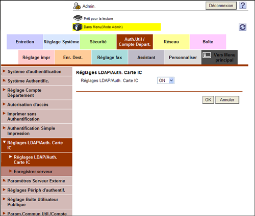 En mode Administrateur, sélectionnez [Auth.Util/Compte Départ.] - [Réglages LDAP/Auth. Carte IC] - [Réglages LDAP/Auth. Carte IC] et définissez [Réglages LDAP/Auth. Carte IC] sur [ON] (par défaut : [OFF]).
