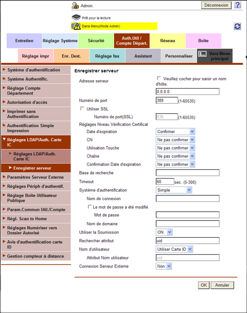 En mode Administrateur, sélectionnez [Auth.Util/Compte Départ.] - [Réglages LDAP/Auth. Carte IC] - [Enregistrer serveur] - [Editer], puis configurez les réglages suivants.