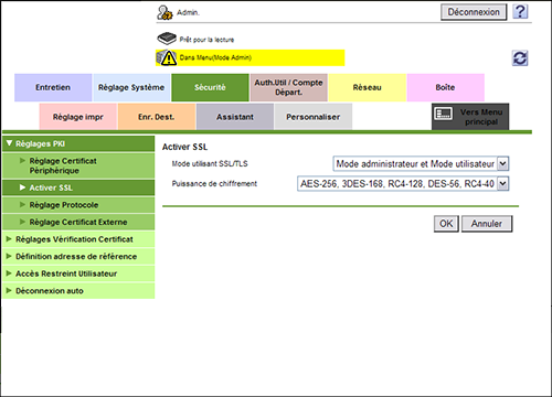 En mode Administrateur, sélectionnez [Sécurité] - [Réglages PKI] - [Activer SSL], puis configurez les paramètres suivants.