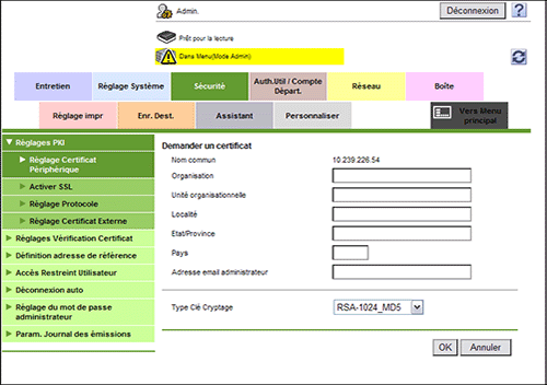 En mode Administrateur, sélectionnez [Sécurité] - [Réglages PKI] - [Réglage Certificat Périphérique] - [Nouvel enregistrement] - [Demander un certificat] et saisissez les informations requises pour l'émission d'un certificat, puis cliquez sur [OK].