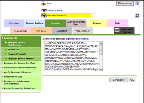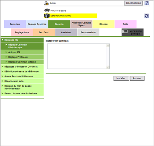 En mode Administrateur, sélectionnez [Sécurité] - [Réglages PKI] - [Réglage Certificat Périphérique] - [Réglage] - [Installer un certificat] et collez les données texte envoyées par l'autorité de certification (CA), puis cliquez sur [Installer].