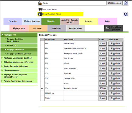 En mode Administrateur, cliquez sur [Sécurité] - [Réglages PKI] - [Réglage Protocole] - [Créer], puis sélectionnez un certificat à utiliser pour le protocole.