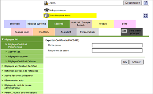 En mode Administrateur, sélectionnez [Sécurité] - [Réglages PKI] - [Réglage Certificat Périphérique] - [Réglage] - [Exporter Certificats] et saisissez un mot de passe (32 caractères max.), puis cliquez sur [OK].