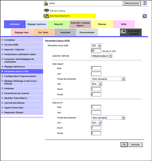 En mode Administrateur, sélectionnez [Entretien] - [Paramètre heure d'été], puis configurez les réglages suivants.