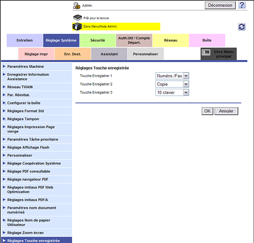 En mode administrateur, sélectionnez [Réglage Système] - [Réglages Touche enregistrée], spécifiez une fonction pour chaque touche Enregistrer depuis [Copie], [Numéris./ Fax], [Boîte], [Navigateur], [Utilitaire], [APP], [10 clavier], [Agrandir l'affichage], [Aide], [Assistance vocale], [Menu], [ID], [Application Enregistrée] et [Impression universelle].