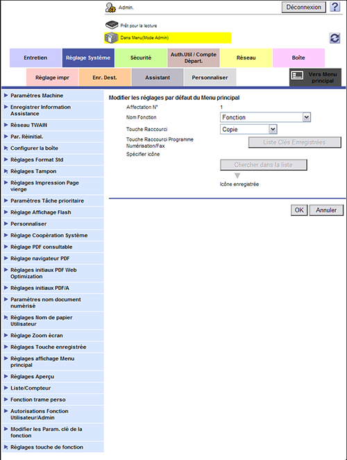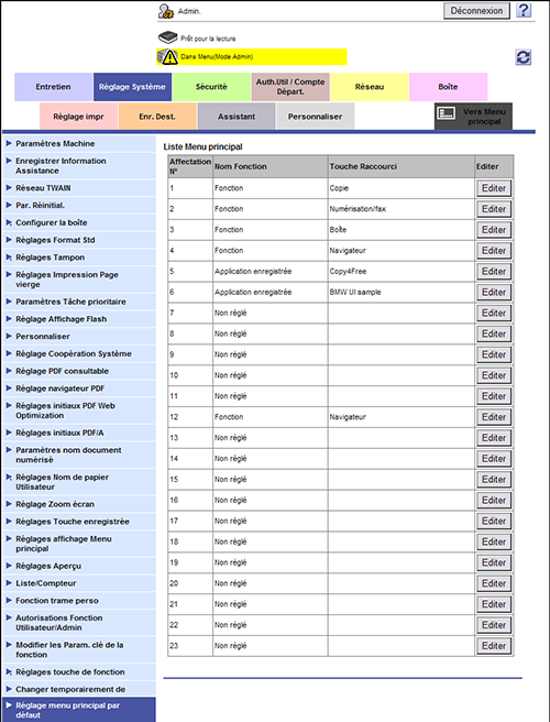 En mode Administrateur, sélectionnez [Réglage Système] - [Réglage menu principal par défaut] pour sélectionner [Affectation N°] pour la touche du menu principal qui arrange les touches de raccourci, puis cliquez sur [Editer].