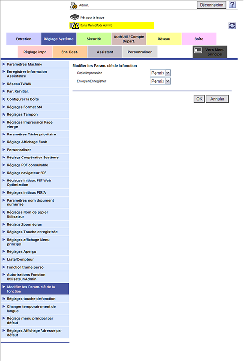 En mode Administrateur, sélectionnez [Réglage Système] - [Modifier les Param. clé de la fonction], puis définissez [Copie/Impression] ou [Envoyer/Enregistrer] sur [Permis].
