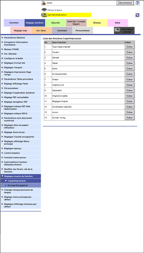 En mode Administrateur, sélectionnez [Réglage Système] - [Réglages touche de fonction] - [Copie/Impression] pour sélectionner le numéro de la touche de fonction dont vous souhaitez modifier le réglage, puis cliquez sur [Editer].