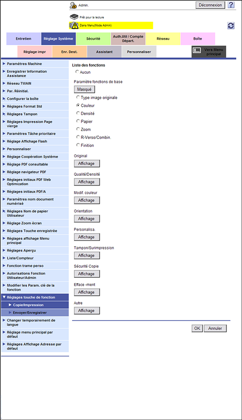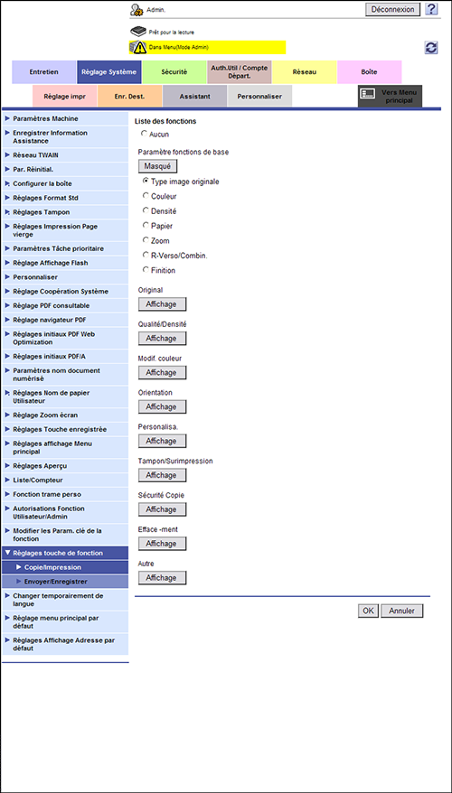 [Copie/Impression] | Spécifiez s'il faut autoriser les modifications des touches de fonction à afficher sur l'écran principal en mode Copie et sur l'écran des réglages d'impression en mode Boîte utilisateur. [Interdit] est spécifié par défaut. |