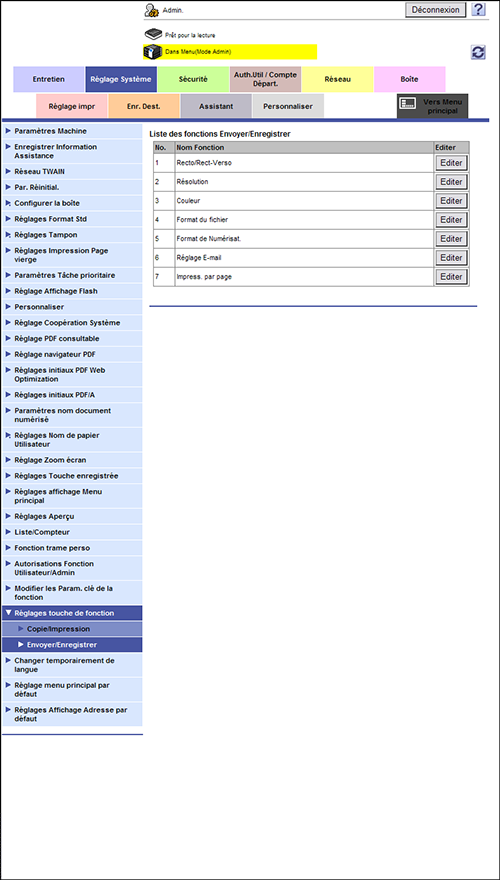 En mode Administrateur, sélectionnez [Réglage Système] - [Réglages touche de fonction] - [Envoyer/Enregistrer] pour sélectionner le numéro de la touche de fonction dont vous souhaitez modifier le réglage, puis cliquez sur [Editer].