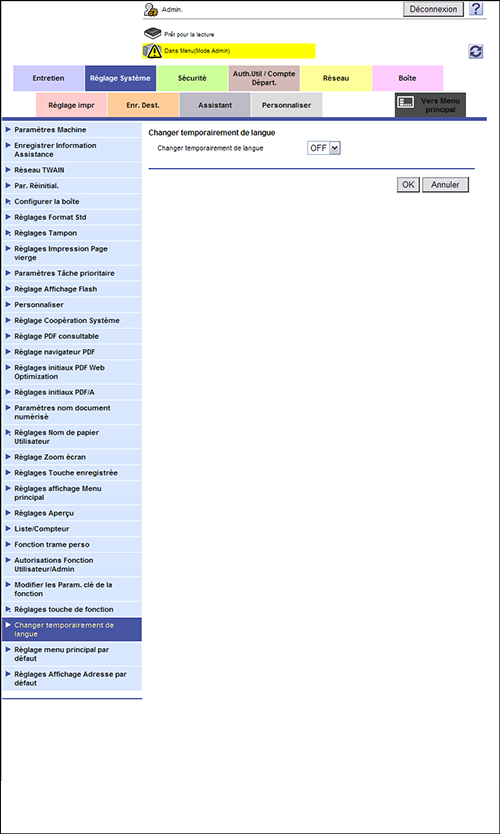 En mode Administrateur, sélectionnez [Réglage Système] - [Changer temporairement de langue] et définissez [Changer temporairement de langue] sur [ON] (par défaut : [OFF]).