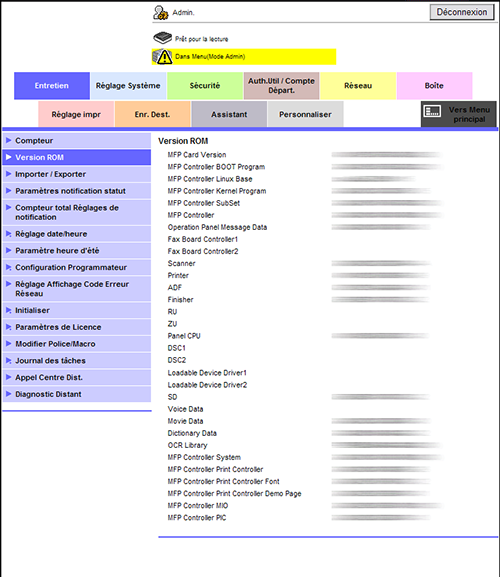 Pour vérifier les informations de la version ROM de cette machine, sélectionnez, en mode Administrateur, [Entretien] - [Version ROM].