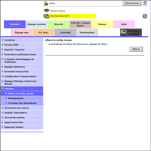 En mode Administrateur, sélectionnez [Entretien] - [Initialiser] - [Effacer la config. réseau], puis cliquez sur [Effacer].