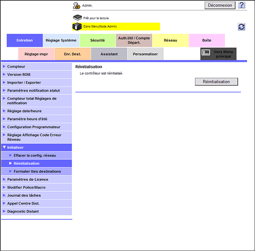 En mode Administrateur, sélectionnez [Entretien] - [Initialiser] - [Réinitialisation], puis cliquez sur [Réinitialisation].