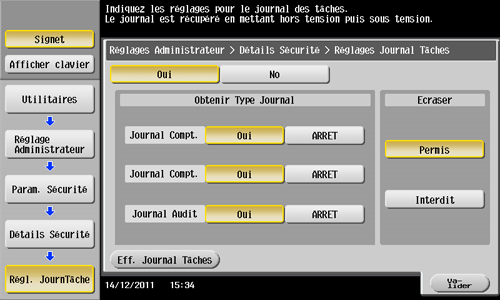 Sur le Panneau de contrôle, tapez sur [Utilitaire] - [Réglage Administrateur] - [Param. Sécurité] - [Détails Sécurité] - [Régl. JournTâche] et configurez le paramètre suivant.