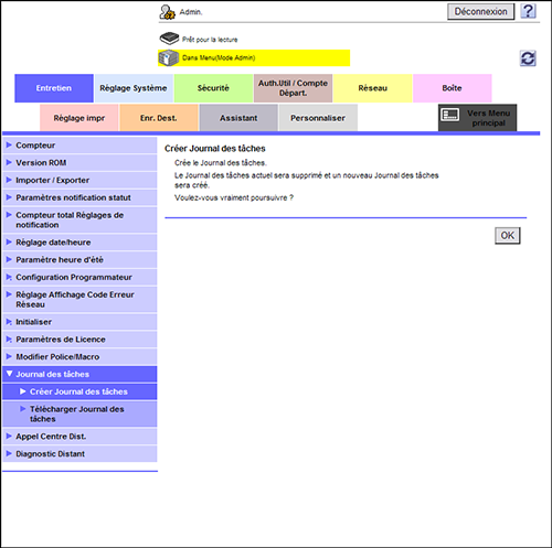 En mode Administrateur, sélectionnez [Entretien] - [Journal des tâches] - [Créer Journal des tâches], puis cliquez sur [OK].