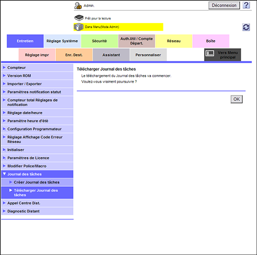 En mode Administrateur, sélectionnez [Entretien] - [Journal des tâches] - [Télécharger Journal des tâches], puis cliquez sur [OK].