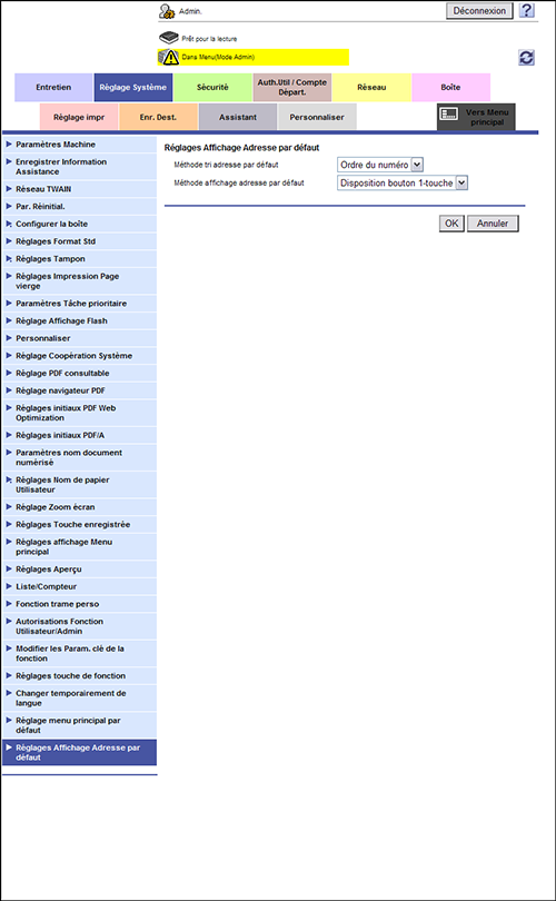 En mode Administrateur, sélectionnez [Réglage Système] - [Réglages Affichage Adresse par défaut] et configurez les réglages suivants.