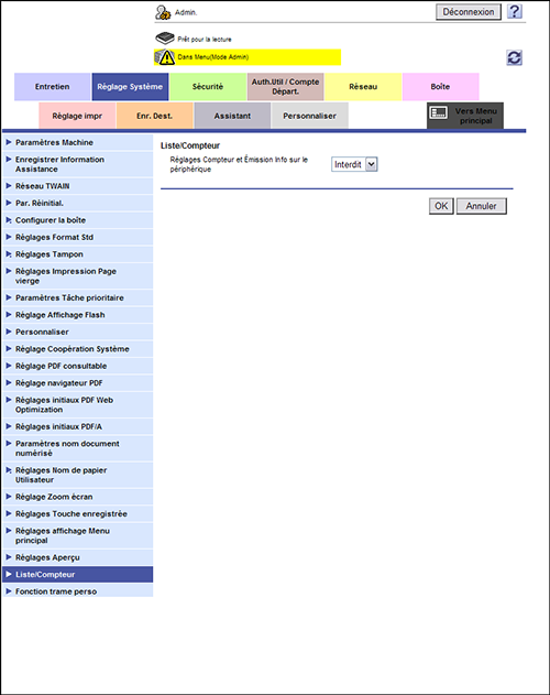 En mode Administrateur, sélectionnez [Réglage Système] - [Liste/Compteur] et définissez [Réglages Compteur et Émission Info sur le périphérique] sur [Permis]. (Par défaut : [Interdit])