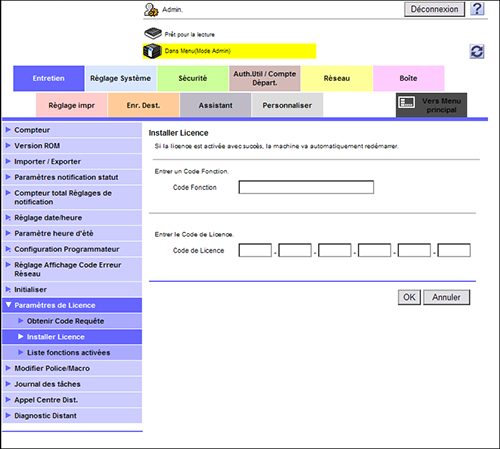 En mode Administrateur, sélectionnez [Entretien] - [Paramètres de Licence] - [Installer Licence] et saisissez les codes de la fonction et de la licence, puis cliquez sur [OK].