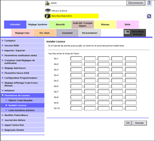 En mode Administrateur, sélectionnez [Entretien] - [Paramètres de Licence] - [Installer Licence] et saisissez le numéro de token, puis cliquez sur [OK].