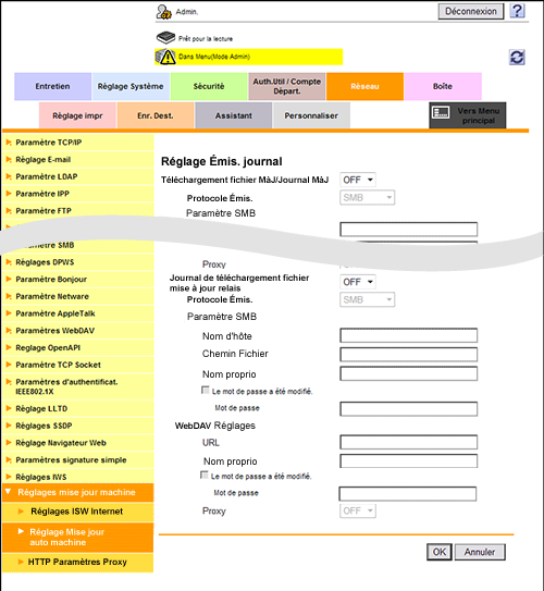 Si nécessaire, en mode administrateur, sélectionnez [Réseau] - [Réglages mise jour machine] - [HTTP Paramètres Proxy], puis configurez les paramètres proxy.
