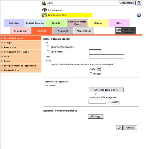 En mode Administrateur, sélectionnez [Enr. Dest.] - [Carnet d'adresses] - [Nouvel enregistrement] - [Boîte], puis cliquez sur [OK] pour configurer les réglages suivants.