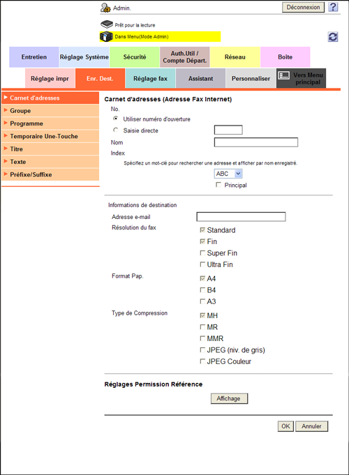En mode Administrateur, sélectionnez [Enr. Dest.] - [Carnet d'adresses] - [Nouvel enregistrement] - [Adresse Fax Internet], puis cliquez sur [OK] pour configurer les réglages suivants.
