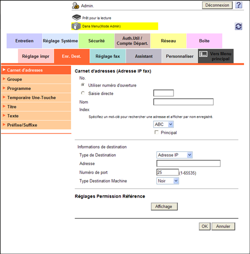 En mode Administrateur, sélectionnez [Enr. Dest.] - [Carnet d'adresses] - [Nouvel enregistrement] - [Adresse IP fax], puis cliquez sur [OK] pour configurer les réglages suivants.