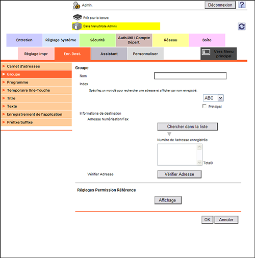 Un groupe peut être enregistré ou modifié à l'aide de Web Connection. Bien qu'il soit difficile de saisir des caractères à l'aide de l'Écran tactile, cette procédure peut être effectuée aisément si vous utilisez l'ordinateur.