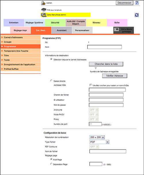 En mode Administrateur, sélectionnez [Enr. Dest.] - [Programme] - [Enregistrement] - [FTP], puis cliquez sur [OK] pour configurer les réglages suivants.