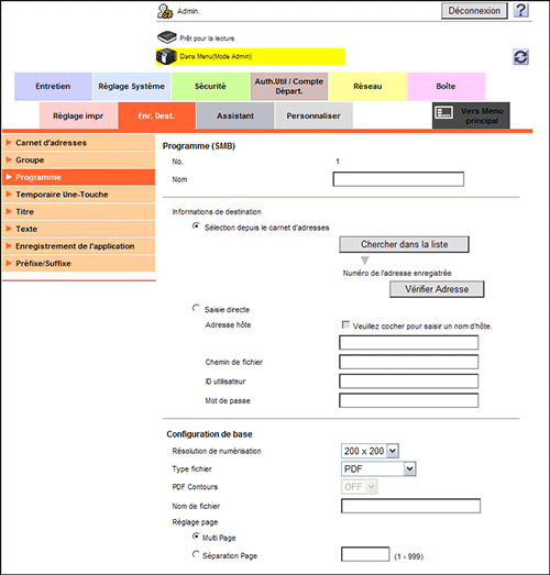 En mode Administrateur, sélectionnez [Enr. Dest.] - [Programme] - [Enregistrement] - [SMB], puis cliquez sur [OK] pour configurer les réglages suivants.