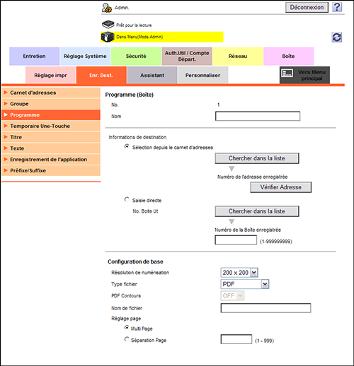 En mode Administrateur, sélectionnez [Enr. Dest.] - [Programme] - [Enregistrement] - [Boîte], puis cliquez sur [OK] pour configurer les réglages suivants.