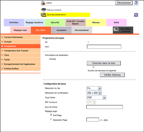 En mode Administrateur, sélectionnez [Enr. Dest.] - [Programme] - [Enregistrement] - [Groupe], puis cliquez sur [OK] pour configurer les réglages suivants.