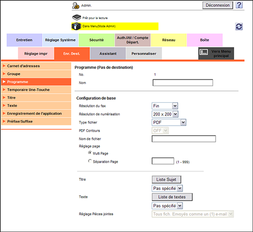 En mode Administrateur, sélectionnez [Enr. Dest.] - [Programme] - [Nouveau] - [Pas de destination], puis cliquez sur [OK] pour configurer les réglages suivants.