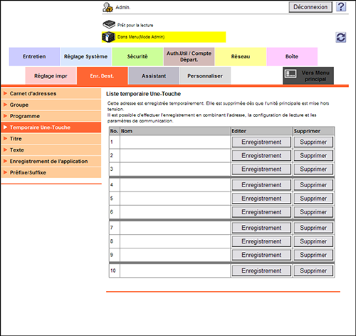 En mode Administrateur, sélectionnez [Enr. Dest.] - [Temporaire Une-Touche], puis configurez les paramètres. La destination Temporaire Une-Touche à enregistrer est la même que l'adresse programme enregistrée.