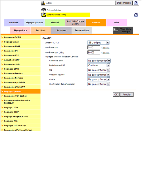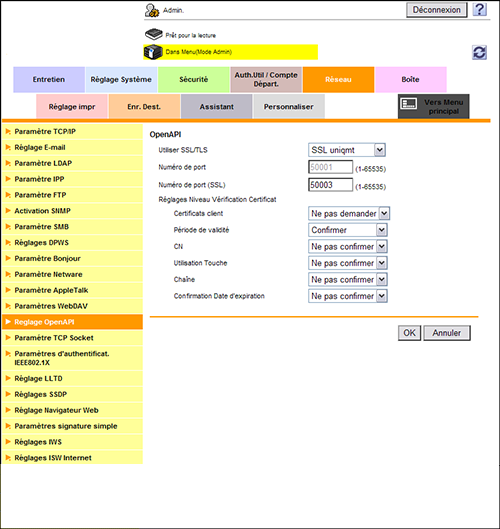 En mode Administrateur, sélectionnez [Réseau] - [Réglage OpenAPI] et modifiez le numéro de port, le cas échéant (par défaut : [50001]).