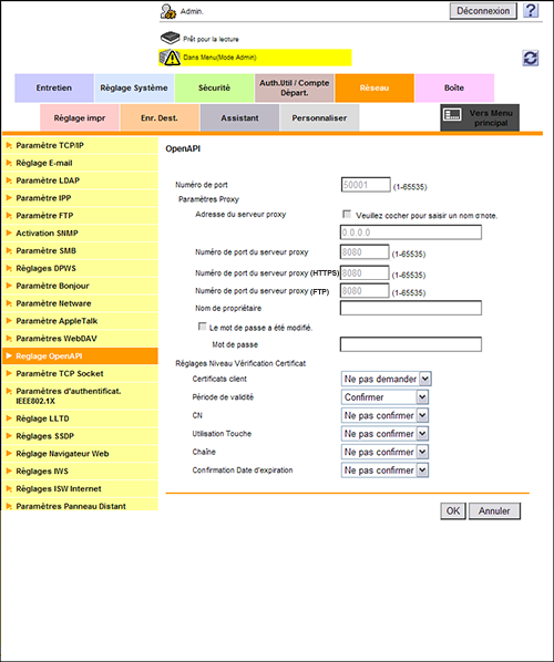 En mode Administrateur, sélectionnez [Réseau] - [Réglage OpenAPI], puis configurez les paramètres suivants.