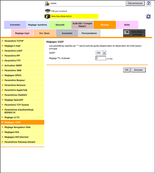En mode Administrateur, sélectionnez [Réseau] - [Réglages SSDP], puis configurez les paramètres suivants.