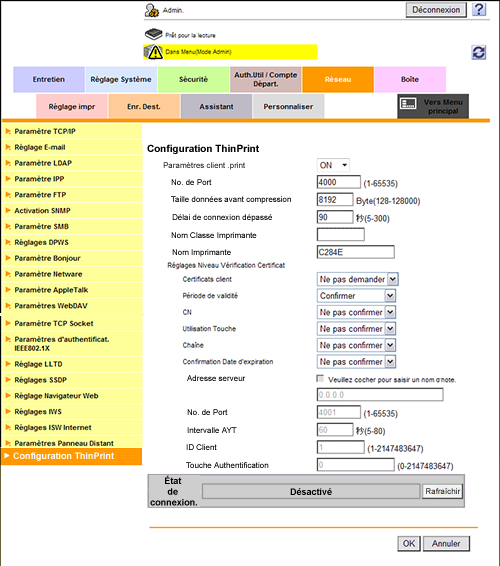 En mode Administrateur, sélectionnez [Réseau] - [Configuration ThinPrint], puis configurez les paramètres suivants.