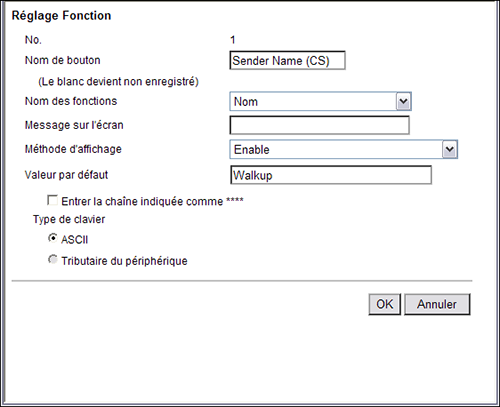 [Valeur par défaut] | Entrez la valeur par défaut. Le nombre de caractères pouvant être saisis diffère selon la fonction sélectionné dans [Nom des fonctions]. Pour masquer la valeur par défaut, cochez la case [Entrer la chaîne indiquée comme ****]. |