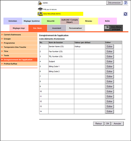 En mode Administrateur, sélectionnez [Enr. Dest.] - [Enregistrement de l'application] pour sélectionner l'emplacement dans lequel vous souhaitez enregistrer les applications et cliquez sur [Enregistrement/Edition].