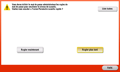 En outre, si le mot de passe de l'administrateur reste réglé sur le mot de passe par défaut ou si les règles de mot de passe ne sont pas satisfaites, l'écran d'avertissement de sécurité s'affiche sur le Panneau de contrôle pour vous inviter à changer le mode de passe de l'administrateur et satisfaire les règles de mot de passe.